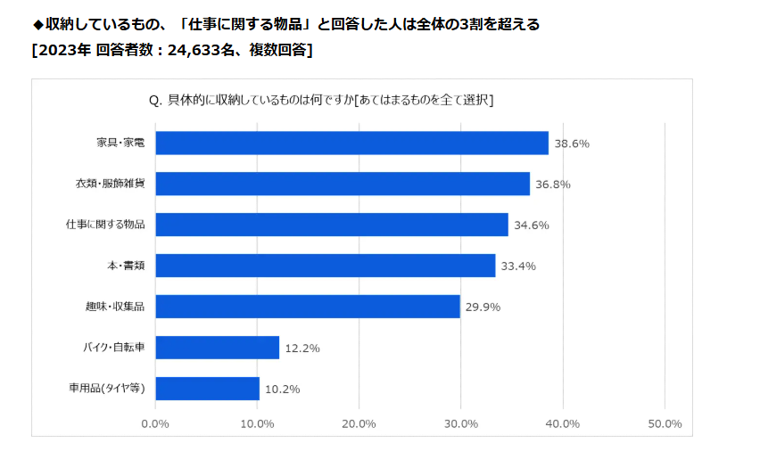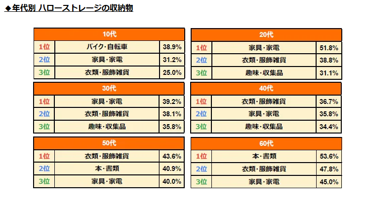 また、収納物ランキングではどの年代でも「家具・家電」が上位に入り、40代までは「趣味や収集品」の預け入れも多いという結果が出ています。