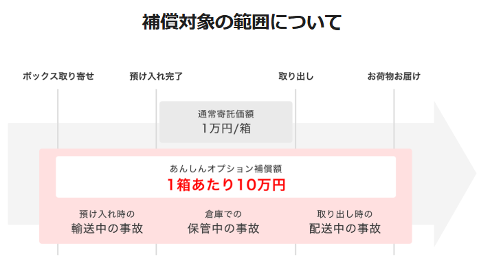 通常の補償内容は、保管期間のみ対象で金額は1箱最大1万円まで。