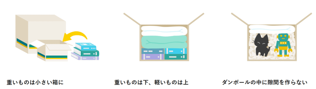 荷物を入れる時のひと手間として、段ボールのテープの張り方や、荷物の梱包の仕方を紹介します。
