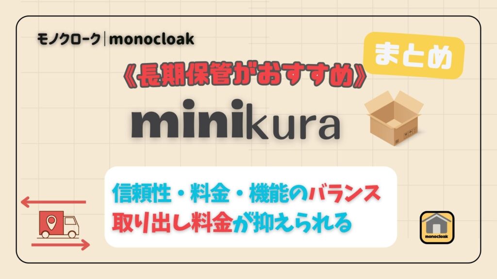 《結論》ミニクラは、信頼性・料金のバランスも取れ、取り出し料金もリーズナブルな宅配型トランクルーム」です。