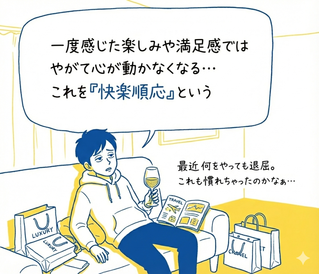 心理学では「快楽適応」と呼ばれる現象があり、人は新しい刺激にすぐ慣れてしまうのです。