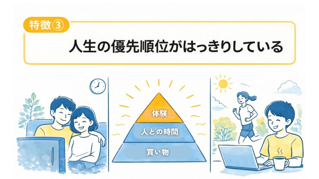 人生の優先順位がはっきりしている人は、家族との時間、自分の体験といった「形に残らないモノ」を大切にしています。
