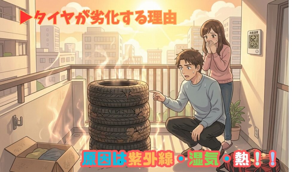 ベランダ保管において、タイヤが劣化する原因は3つあります。