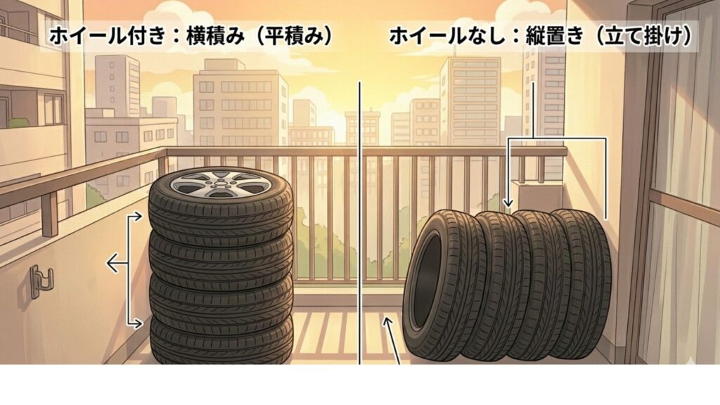 タイヤ保管はホイールの有無によって最適な向きが異なります。